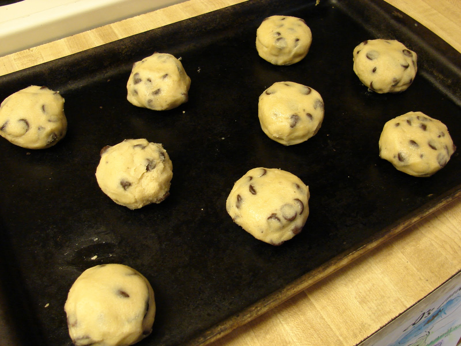 Smoosh. Show the cookie who’s boss here. If the batter sticks to your hands set the bowl in the refrigerator while you lick the beaters clean up the kitchen. Just about 10 minutes will do. Be sure to have dry hands – even a little flour on your hands would help.<