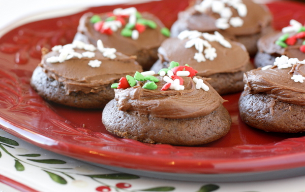 Every year in December I do something called the 12 Days of Christmas Treats where I post a new Christmas recipe every day for 12 days. You’d think that I would be burnt out on Christmas cookies, but no! When Katrina invited me to participate in I’ll Bring the Cookies, I already had the perfect cookie recipe picked out – Frosted Chocolate Cupcake Tops! These cookies are moist, chocolatey and best of all are covered in creamy chocolate frosting. Yum! J