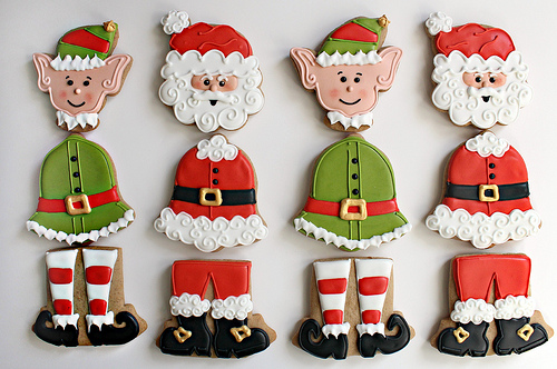 UPDATE: Callye had a BIG IDEA and is combining 3 guest posts to bring you Santa BELL-Y Cookies! See her tutorial on how to create Santa’s belly over at Life’s a Batch and his legs at Love From the Oven. The tutorial for the elf cookies is on her site.